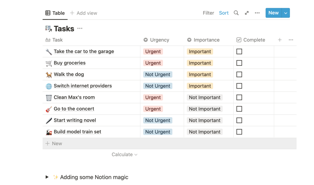 The Eisenhower Matrix is a great way to organize your tasks, to make sure that you work on what's important and not just what's urgent. This template enables you to update the status of your tasks by dragging and dropping them into a different section of the matrix.